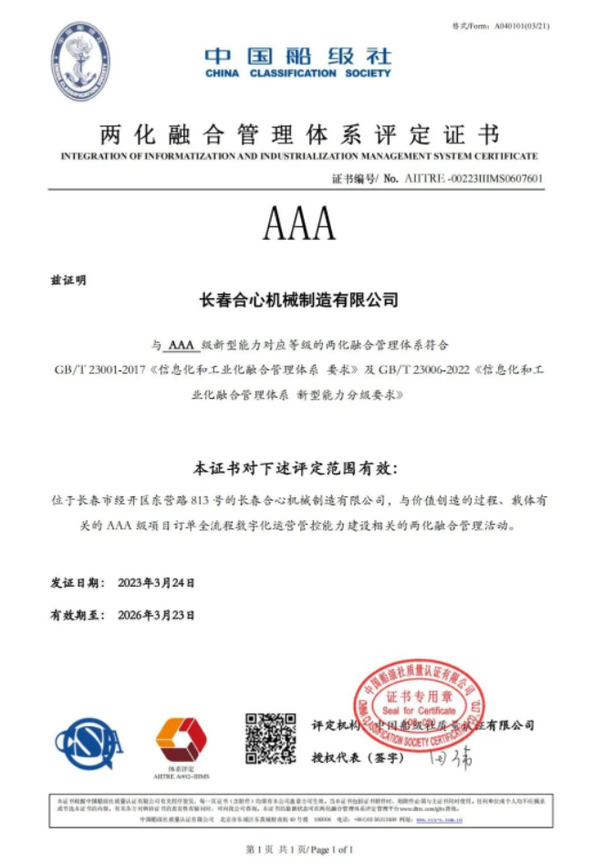 近日,長春合心機(jī)械制造有限公司(以下稱“合心機(jī)械”)宣布,公司已榮獲由中國船級社頒發(fā)的AAA級兩化融合管理體系評定證書。合心機(jī)械是吉林省首家獲得該資質(zhì)的民營企業(yè)。